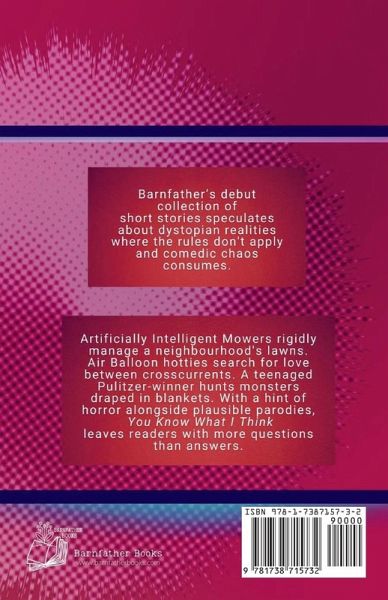 This collection of thirteen short stories speculates about dystopian realities where the rules don't apply and comedic chaos consumes. Artificially Intelligent Mowers rigidly manage a neighbourhood's lawns. Air Balloon hotties search for love between cross-currents. A teenaged Pulitzer-winner hunts monsters draped in blankets. With a hint of horror alongside plausible parodies, YOU KNOW WHAT I THINK? leaves readers with more questions than answers.