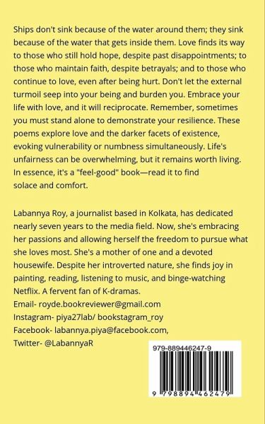 Ships don't sink because of the water around them; they sink because of the water that gets inside them. Love finds its way to those who still hold hope, despite past disappointments; to those who maintain faith, despite betrayals; and to those who continue to love, even after being hurt. Don't let the external turmoil seep into your being and burden you. Embrace your life with love, and it will reciprocate. Remember, sometimes you must stand alone to demonstrate your resilience. These poems explore love and the darker facets of existence, evoking vulnerability or numbness simultaneously. Life's unfairness can be overwhelming, but it remains worth living. In essence, it's a "feel-good" book-read it to find solace and comfort.