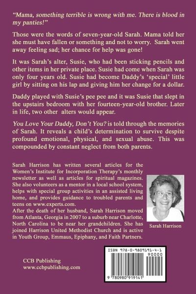"Mama, something terrible is wrong with me. There is blood in my panties!" Those were the words of seven-year-old Sarah. Mama told her she must have fallen or something and not to worry. Sarah went away feeling sad; her chance for help was gone! It was Sarah's alter, Susie, who had been sticking pencils and other items in her private place. Susie had come when Sarah was only four years old. Susie had become Daddy's 'special' little girl by sitting on his lap. In return he gave her a dollar for any change she had. Daddy played with Susie's pee pee and it was Susie that slept in the upstairs bedroom with her fourteen-year-old brother. Later in life, two other alters would appear. You Love Your Daddy, Don't You? is told through the memories of Sarah. It reveals a child's determination to survive despite profound emotional, physical, and sexual abuse. This was compounded by constant neglect from both parents. About the Author: Sarah Harrison has written several articles for the Women's Institute for Incorporation Therapy's monthly newsletter as well as articles for spiritual magazines. She also volunteers as a mentor in a local school system, helps with special group activities in an assisted living home, and provides guidance to troubled parents and teens on www.experts.com. After the death of her husband, Sarah Harrison moved from Atlanta, Georgia in 2007 to a suburb near Charlotte, North Carolina to be near her grandchildren. She has joined Harrison United Methodist Church and is active in Youth Group, Emmaus, Epiphany, and Faith Partners.