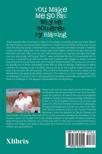 The provocative title of this book is meant for the reader to instantly protest and think, "What? No way!" Suppose you had just been treated to an elegant and completely satisfying ten course meal that leisurely lasted a full three hours. I once enjoyed such meal on board a Celebrity Cruise Line ship sailing back from Alaska. Had some sophist cornered me upon leaving the restaurant and said, "Wait a minute, and I will convince you by argument and logic that really, now, you are actually still hungry." Well, if I were confronted like that I'd immediately tell the fool he is a fool and to go find some other fool to debate with. Hunger is clearly a visceral experience. How do you know when you're hungry? Stupid question. Of course, you just know; it's actually one of those self-evident truths that we hold. It's likewise foolishness to blame someone for making you fat. No adults, anyway, are force fed a caloric intake in excess of what they can burn off with exercise. They do that to themselves. So, no one makes me fat. Nevertheless, the syntactically similar statement, "You make me so mad I could scream" goes unchallenged. It seems to be not only plausible but probably reasonable and legitimate. This book is a challenge to that apparent reasonableness and legitimacy.