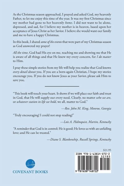 As the Christmas season approached, I prayed and asked God, my heavenly Father, to let me enjoy this time of the year. It was my first Christmas since my mother had gone to her heavenly home. I did not want to be alone, depressed, and sad, for I believe my mother is in heaven, based upon her acceptance of Jesus Christ as her Savior. I believe she would want our family and me to have a happy Christmas. In this book, I shared some of the events that were part of my Christmas season as God answered my prayer! All the time, God had His eye on me, teaching me and showing me that He is aware of all things and that He knew my every concern, for I do matter to Him. I pray these simple stories from my life will help you realize that God knows every detail about you. If you are a born-again Christian, I hope my stories encourage you. If you do not know Jesus as your Savior, please ask Him to save you. "This book will touch your heart. It shows if we will place our faith and trust in God, that He will supply our every need. Clearly, no matter who we are, or whatever station in life we hold, we all, matter to God." -Rev. John M. King, Monroe, Georgia "Truly encouraging! I could not stop reading!" -Lois A. Holmquist, Martin, Kentucky