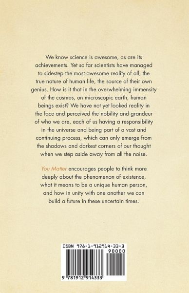 We know science is awesome, as are its achievements. Yet so far scientists have managed to sidestep the most awesome reality of all, the true nature of human life, the source of their own genius. How is it that in the overwhelming immensity of the cosmos, on microscopic earth, human beings exist? We have not yet looked reality in the face and perceived the nobility and grandeur of who we are, each of us having a responsibility in the universe and being part of a vast and continuing process, which can only emerge from the shadows and darkest corners of our thought when we step aside away from all the noise. 'You Matter' encourages people to think more deeply about the phenomenon of existence, what it means to be a unique human person, and how in unity with one another we can build a future in these uncertain times.