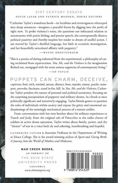 "Things puppets can do to us: charm, deceive, captivate, fool, trick, remind, amuse, distract, bore, repulse, annoy, puzzle, transport, provoke, fascinate, stand in for, kill." In You, Me, and the Violence, Catherine Taylor ponders the nature of personal and political autonomy, focusing on the surprising juxtaposition of puppetry and military drones. In a book at once politically significant and narratively engaging, Taylor blends genres to question the roles of individuals within society and expose the gritty and emotional underpinnings of the seemingly mechanical process of a remote soldier. From conversations with her own brother about his military experiences to Punch and Judy, from the original tale of Pinocchio to the radio chatter of soldiers in active drone operation, Taylor writes about family, power, and the "theater" of war in a voice both sly and sobering, heartbreaking and hopeful.