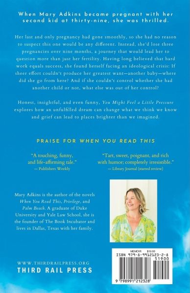 When Mary Adkins became pregnant with her second kid at thirty-nine, she was thrilled. Instead of a smooth pregnancy, she'd lose three pregnancies over nine months, a journey that would lead her to question more than just her fertility. Having long believed that hard work equals success, she found herself facing an ideological crisis: If sheer effort couldn't produce her greatest want- another baby-where did she go from here? And if she couldn't control this, what else was out of her control? Honest, insightful, and even funny, You Might Feel a Little Pressure explores how an unfulfilled dream can change what we think we know, and grief can lead to places brighter than we imagined.