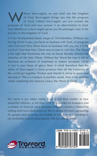 Without born-again, no eye shall see the kingdom of God. Born-again brings you into the program of God; without born-again you are outside the program of God and your prayer is an abomination to God. Your identity as a born-again gives you the passage/way to the journey to the kingdom of God. It is the fundamental/basic stage of Christiandom. Without you having Christ in you, you have no business with God, no program with God and Holy Ghost have no business with you, for it is the word of God that Holy Ghost sees in man to visit Him. The Word is the light that illuminates the man as house thereby attracts the attention of the Holy Ghost. Without the Word the man is full of darkness an evidence of emptiness or enemy occupant. Christ in you is your hope of glory. Bear in mind therefore that the status of born-again is more precious than all the treasures of the world put together. Protect and cherish it, strive to grow and develop it. This is a treasure in earthen vessel. Man is the earthen vessel containing the treasure (Jesus, the Word of God)