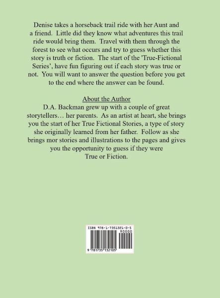 Denise takes a horseback trail ride with her Aunt and a friend. Little did they know what adventures this trail ride would bring them. Travel with them through the forest to see what occurs and try to guess whether this story is truth or fiction. The start of the 'True-Fictional Series, have fun figuring out if each story was true or not. You will want to answer the question before you get to the end where the answer can be found.
