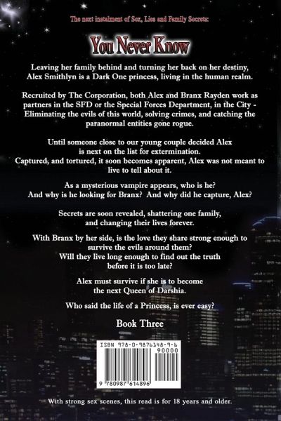 Leaving her family behind, and escaping her future, Alex Smithlyn attempts to live amongst the humans and away from Dark Ones and her destiny. Alex and Branx Rayden work as partners at The Corporation, in the city - SFD or the Special Forces Department. Capturing and eliminating the evils of this world, until someone close to our young couple decided Alex is next on the list for extermination. As her past catches up to her, while using her hidden abilities. Alex will require her family’s help more than ever, to keep her and Branx safe. As a mysterious man appears, who is he, and why did he want to capture, Alex? Secrets are revealed, shattering one families love. Alex must survive if she is to become the next Queen of Darshia. Who said the life of a Princess, is ever easy? Read alone or follow on after book two.