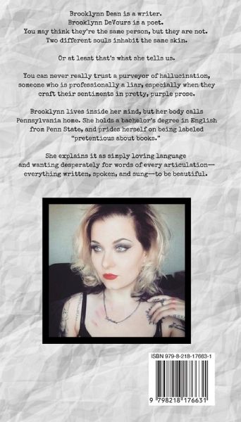 Brooklynn Dean is a writer. Brooklynn DeVours is a poet. You may think they're the same person, but they are not. Two different souls inhabit the same skin. Or at least that's what she tells us. You can never really trust a purveyor of hallucination, someone who is professionally a liar, especially when they craft their sentiments in pretty, purple prose. Brooklynn lives inside her mind, but her body calls Pennsylvania home. She holds a bachelor's degree in English from Penn State, and prides herself on being labeled "pretentious about books." She explains it as simply loving language and wanting desperately for words of every articulation-everything written, spoken, and sung-to be beautiful.