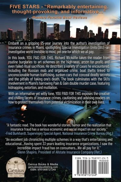 Embark on a gripping 25-year journey delving into the author's investigation of insurance crimes in Miami, spotlighting Special Investigation Units (SIU) -an investigative world invisible to most, yet one for which we all pay. In YOU PAID FOR THIS, Richard Wickliffe takes the reader from routine burglaries to art theft on the high-seas, arson for profit, and even failed ritual sacrifices. He describes a variety of cases he encountered, including the Russian mob and organized crime, boat thefts linked to unconscionable human trafficking, sunken cars that conceal deadly secrets, and the pitfalls of faking one's death. The book culminates with the SIU's involvement in Miami's harrowing Pain & Gain double murder case, featuring kidnapping, extortion, and mutilation. With an informative yet witty tone, YOU PAID FOR THIS exposes the creative and chilling facets of insurance crimes, cautioning and advising readers on how to protect themselves from potential victimization in their own lives.
