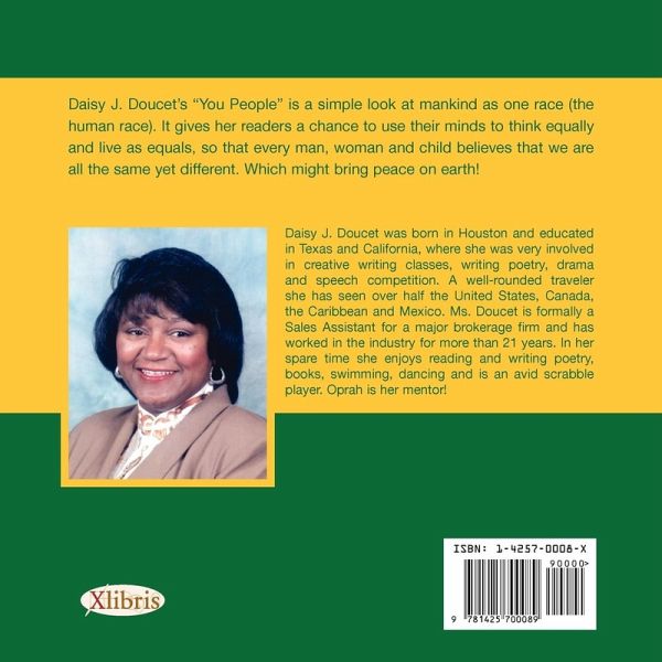 Daisy J. Doucet's "You People" is a simple look at mankind as one race (the human race). It gives her readers a chance to use their minds to think equally and live as equals, so that every man, woman and child believes that we are all the same yet different. Which might bring peace on earth!