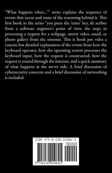 "What happens when...(TM)" series explains the sequence of events that occur and some of the reasoning behind it. This first book in the series "you press the 'enter' key, de scribes from a software engineer's point of view, the steps in processing a request for a webpage, movie video, email, or photo gallery from the internet. This is book pro vides a concise but detailed explanation of the events from how the keyboard operates, how the operating system processes the keyboard input, how the request is constructed, how the request is routed through the internet, and a quick summary of what happens at the server side. A brief discussion of cybersecurity concerns and a brief discussion of networking is included.