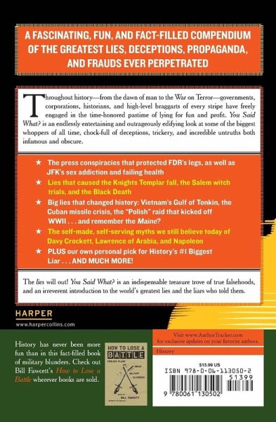 A fascinating, fun, and fact-filled compendium of the greatest lies, deceptions, propaganda, and frauds ever perpetrated Throughout history--from the dawn of man to the War on Terror--governments, corporations, historians, and high-level braggarts of every stripe have freely engaged in the time-honored pastime of lying for fun and profit. You Said What? is an endlessly entertaining and outrageously edifying look at some of the biggest whoppers of all time, chock-full of deceptions, trickery, and incredible untruths both infamous and obscure. The press conspiracies that protected FDR's legs, as well as JFK's sex addiction and failing health Lies that caused the Knights Templar fall, the Salem witch trials, and the Black Death Big lies that changed history: Vietnam's Gulf of Tonkin, the Cuban missile crisis, the "Polish" raid that kicked off WWII . . . and remember the Maine? The self-made, self-serving myths we still believe today of Davy Crockett, Lawrence of Arabia, and Napoleon Plus our own personal pick for History's #1 Biggest Liar . . . and much more! The lies will out! You Said What? is an indispensable treasure trove of true falsehoods, and an irreverent introduction to the world's greatest lies and the liars who told them.
