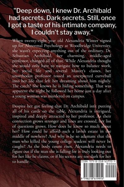 When twenty-eight year old Alexandria Winter signed up for Abnormal Psychology at Woodbridge University, she wasn't expecting anything out of the ordinary. Dr. Sebastian Archibald, her charming, middle-aged professor, changed all of that. While Alexandria thought she would only have to navigate how to balance work, her social life and several Master's classes, her unorthodox professor tossed an unexpected curveball into her life that left her dreaming about him nightly. The catch? She knows he is hiding something. That was apparent the night he followed her home just a day after a young woman was murdered on campus. Despite her gut feeling that Dr. Archibald isn't putting all of his cards on the table, Alexandria is intrigued, inspired and deeply attracted to her professor. As their connection grows stronger and lines are crossed, her list of questions grows. How does he know so much about her? How could he afford such a lavish estate in the middle of nowhere? And why is he so adamant that the man who killed the young college student will never be caught? As the body count rises, Alexandria needs to figure out if the man she is falling for is truly looking out for her like he claims, or if his secrets are too dark for her to handle.