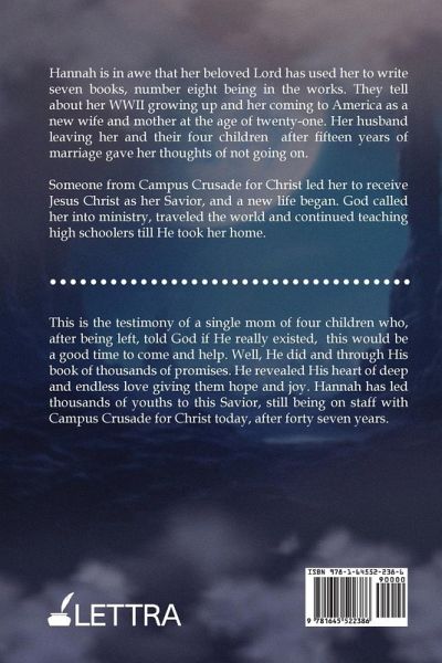 This is the testimony of a single mom of four children who, after being left, told God if He existed, this would be a good time to come and help. Well, He did, and through His book of thousands of promises. He revealed His heart of deep and endless love giving them hope and joy. Hannah has led thousands of youths to this Savior, still being on staff with Campus Crusade for Christ today, after forty-seven years.