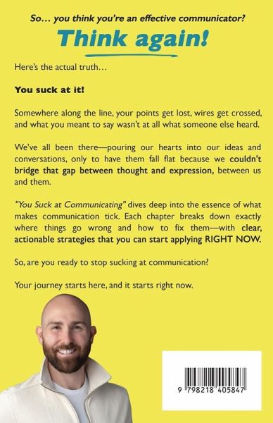 So... you think you're an effective communicator? Think again! Here's the actual truth... You suck at it! Somewhere along the line, your points get lost, wires get crossed, and what you meant to say wasn't at all what someone else heard. We've all been there-pouring our hearts into our ideas and conversations, only to have them fall flat because we couldn't bridge that gap between thought and expression, between us and them. "You Suck at Communicating" dives deep into the essence of what makes communication tick. Each chapter breaks down exactly where things go wrong and how to fix them-with clear, actionable strategies that you can start applying RIGHT NOW. So, are you ready to stop sucking at communication? Your journey starts here, and it starts right now.