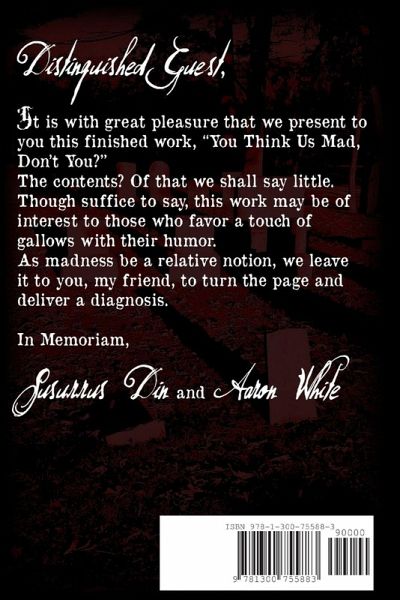 Bid farewell to your precious sanity with eight original poems by Susurrus Din and twenty-five unique illustrations by Aaron White. Reminiscent of Victorian-era cautionary tales, whereby some fiendish agency nearly everyone comes to an unseemly end;"You Think Us Mad, Don't You?" offers earnest admonishments against such follies as eating tea biscuits on Wednesdays, as you are likely to be beset by a sudden swarm of killer bees. So cackle maniacally and wring your hands in malefic glee, for "You Think Us Mad, Don't You?" grants you free reign to indulge equally your darkest desires and most devious devices.