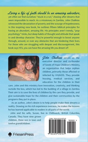 Living a life of faith should be an amazing adventure, yet often we find ourselves "stuck in a rut," chasing after dreams that seem impossible to reach. As a missionary in Zambia, John Chalkias witnessed the devastation of poverty and the scourge of hopelessness. In this inspiring new book, he outlines fifteen biblical principles for having an abundant, amazing life. His principles aren't trendy, "pop-psychology" tricks, but deep habits of thought and attitude that speak to and develop character. They're powerful enough to boost anyone through, around, or over any obstacles that are hindering their lives. For those who are struggling with despair and discouragement, this book says YES, you can have the amazing life you dream of!