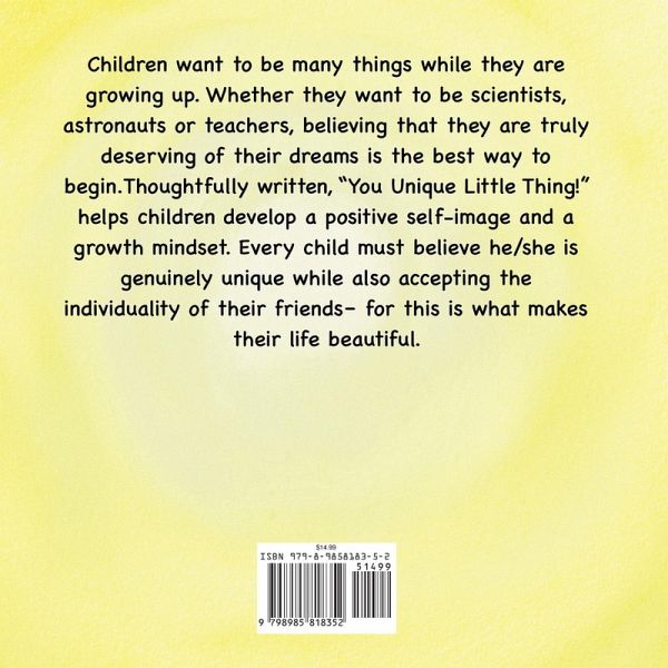 If children need to believe that they truly matter, then teaching them positive self-talk is crucial because words have great power. What they say is what they feel, what they feel is how they will behave and how they behave is what they will become. "You unique little thing" is a book for kids to help them embrace their uniqueness and strengths. Each character in this book cherishes their talents, also while learning to be kind, determined and empathetic. It shows them to pursue their dreams despite failures and obstacles they may face in life. We need to show children it takes multiple factors such as consistency, faith, passion, hard work etc., to realize their dreams.. Children cannot avoid comparison, failures or self-doubt in life. But through a growth mindset and a positive self-image we can teach them how to handle hurdles as they are presented with them.