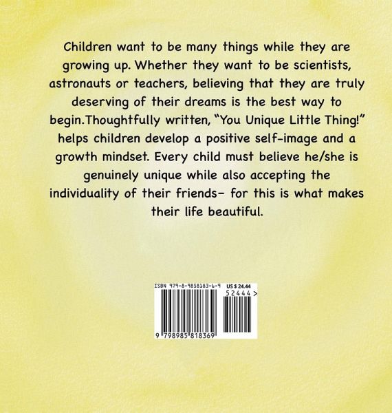 If children need to believe that they truly matter, then teaching them positive self-talk is crucial because words have great power. What they say is what they feel, what they feel is how they will behave and how they behave is what they will become. "You unique little thing" is a book for kids to help them embrace their uniqueness and strengths. Each character in this book cherishes their talents, also while learning to be kind, determined and empathetic. It shows them to pursue their dreams despite failures and obstacles they may face in life. We need to show children it takes multiple factors such as consistency, faith, passion, hard work etc., to realize their dreams.. Children cannot avoid comparison, failures or self-doubt in life. But through a growth mindset and a positive self-image we can teach them how to handle hurdles as they are presented with them.