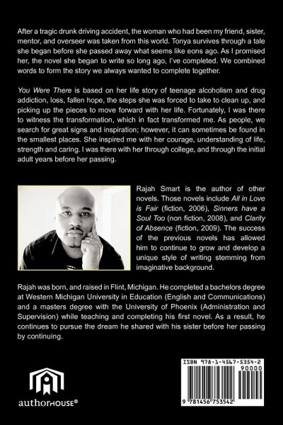 After a tragic drunk driving accident, the woman who had been my friend, sister, mentor, and overseer was taken from this world. Tonya survives through a tale she began before she passed away what seems like eons ago. As I promised her, the novel she began to write so long ago, I've completed. We combined words to form the story we always wanted to complete together. You Were There is based on her life story of teenage alcoholism and drug addiction, loss, fallen hope, the steps she was forced to take to clean up, and picking up the pieces to move forward with her life. Fortunately, I was there to witness the transformation, which in fact transformed me. As people, we search for great signs and inspiration; however, it can sometimes be found in the smallest places. She inspired me with her courage, understanding of life, strength and caring. I was there with her through college, and through the initial adult years before her passing.