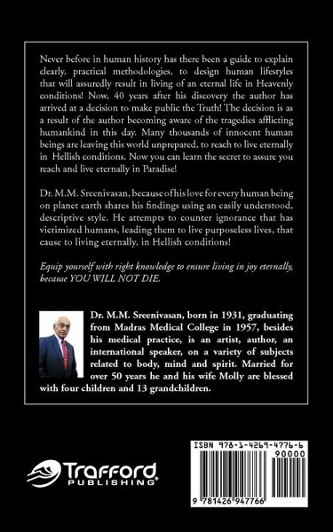 Never before has a guide explained the Light of Truth, the only methodology that can ensure how any human being can design a lifestyle in this human life that will assuredly reward the onward living of an eternal life in Heavenly conditions. The chaotic and intolerable conditions that prevail in the body of mankind at this time, subjecting every human being to live in a shroud of fear that can divert the mind from wanting to independently investigate the meaning of life. Now you too can learn the secret to assuring eternal felicity for yourself! Dr. M.M. Sreenivasan unearthed Truth, although it took him more than forty years to decide to share it with every living human being around the world. Out of true love of every living human being on planet earth, he presents his findings in an easily understood, descriptive style. He attempts to counteract ignorance that could lead to eternal remorse and a meaningless life. Equip yourself with the knowledge necessary to live eternally in joy and learn that You Will Not Die.