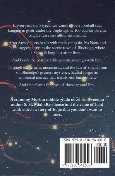 Eleven-year-old Sayeed just wants to be a football star, banging in goals under the bright lights. Too bad his parents couldn't care less about his dreams. After Sayeed butts heads with them yet again, his Nana and Nani suggest a trip to the scenic town of Blueridge, where Sayeed's long-lost sister lives. And here's the best part: his parents won't go with him. Through excitement, uncertainty, and the fun of solving one of Blueridge's greatest mysteries, Sayeed forges an emotional journey that transforms him entirely. And transforms the lives of those around him. A stunning Muslim middle grade novel from veteran author S. H. Miah. Resilience and the value of hard work enrich a story of hope that you don't want to miss.