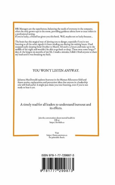 Human Resources is all about confidentiality. But what do you do when that load of secrets in your luggage becomes too heavy to bear? HR Managers are the superheroes, balancing the needs of everyone in the company. They're often the only grown-ups in the room, providing guidance about how to treat others in a professional setting. If you're lucky, a friend has given you this book. Well, maybe not so lucky because: The brain has this magical way of alerting you to danger, especially if you're not listening to all the other signals it's been sending out during the waking hours. I had stopped really sleeping from October to March. I'd catch 2-3 hours and wake up in the middle of the night and wouldn't be able to go back to sleep. Those were some long-axx days and the longest six months of my life. I made a mistake; I didn't find anyone to share my load until it was breaking my back. Written in sometimes shockingly frank language, Julianna takes you on a six year story and hopes you're ready to hear the message. It's OK if you're not ready though, because probably, YOU WON'T LISTEN ANYWAY Julianna explores burnout by sharing some heart-breaking stories and reveals how burnout can sneak up on you. A book for the unsung heroes who fight the good fight on a daily basis and need some self-guided tips to prevent the mental burnout that comes with taking on the company's problems. Written to provide resources, support and ideas to the 'people-people' whose jobs it is to carry the secret burdens of their companies. With tools and guidance, the bosses of Human Resource managers can support and protect their HR team members from burnout. A timely read for all leaders to understand burnout and its effects.