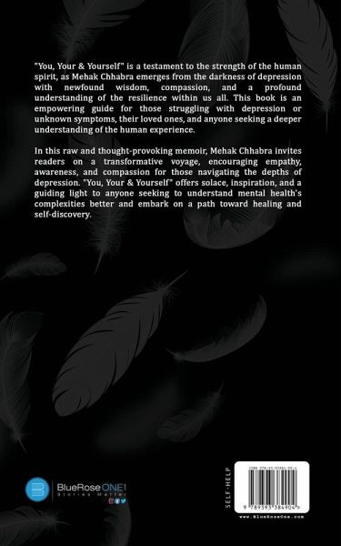 You, Your & Yourself" is a testament to the strength of the human spirit, as Mehak Chhabra emerges from the darkness of depression with newfound wisdom, compassion, and a profound understanding of the resilience within us all. This book is an empowering guide for those struggling with depression or unknown symptoms, their loved ones, and anyone seeking a deeper understanding of the human experience. In this raw and thought-provoking memoir, Mehak Chhabra invites readers on a transformative voyage, encouraging empathy, awareness, and compassion for those navigating the depths of depression. "You, Your & Yourself" offers solace, inspiration, and a guiding light to anyone seeking to understand mental health's complexities better and embark on a path toward healing and self-discovery.