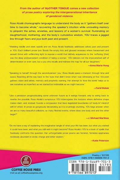 "The prose poems in YOU scour the distance between girlhood and motherhood with wit, fraying into ruminations on all that's inherited as a woman surviving gendered violence. Rosa Alcalâa choreographs language to understand the body as it "gathers itself over time to become whole," recovering the speaker's intuition while unraveling memory to pinpoint the aches, anxieties, and lessons of feminine survival. YOU ruminates on daughterhood, mothering, and the body's cumulative wisdom"--