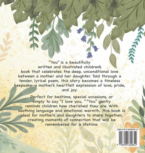"You" is a beautifully written and illustrated children's book that celebrates the deep, unconditional love between a mother and her daughter. Told through a tender, lyrical poem, this story becomes a timeless keepsake-a mother's heartfelt expression of love, pride, and joy. Perfect for bedtime, special occasions, or simply to say "I love you," "You" gently reminds children how cherished they are. With soothing language and emotional warmth, this book is ideal for mothers and daughters to share together, creating moments of connection that will be remembered for a lifetime. Whether you're a new mom, a girl mom, or looking for the perfect gift, "You" is a love letter every daughter deserves to hear.