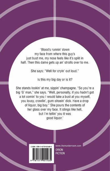 Blood's runnin' down my face from where this guy's just bust me, my nose feels like it's split in half. Then this dame gets up an' strolls over to me - I reckon I am not lookin' quite so good. She says: 'Well for cryin' out loud.' Is this my big day or is it? She stands lookin' at me, sippin' champagne. 'So you're a big "G" man,' she says. 'Well, personally, if you hadn't got a lot comin' to you I would take a bust at you myself, you lousy, crawlin', gum-shoein' dick. Have a drop of liquor, big boy.' She pours the contents of her glass over my face. It stings like hell, but I'm tellin' you it was good liquor.
