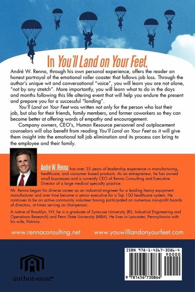 In "You'll Land on Your Feet", André W. Renna, through his own personal experience, offers the reader an honest portrayal of the emotional roller coaster that follows job loss. Through the author's unique wit and conversational "voice", you will learn you are not alone, "not by any stretch". More importantly, you will learn what to do in the days and months following this life altering event that will help you endure the present and prepare you for a successful "landing". "You'll Land on Your Feet" was written not only for the person who lost their job, but also for their friends, family members, and former coworkers so they can become better at offering words of empathy and encouragement. Company owners, CEO's, Human Resource personnel and outplacement counselors will also benefit from reading "You'll Land on Your Feet" as it will give them insight into the emotional toll job elimination and its process can bring to the employee and their family.