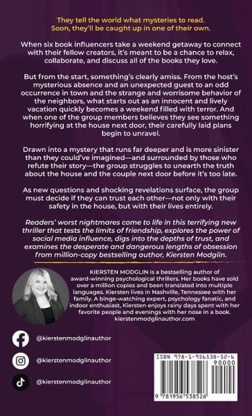 "When six book influencers take a weekend getaway to connect with their fellow creators, it's meant to be a chance to relax, collaborate, and discuss all of the books they love. But from the start, something's clearly amiss. From the host's mysterious absence and an unexpected guest to an odd occurrence in town and the strange and worrisome behavior of the neighbors, what starts out as an innocent and lively vacation quickly becomes a weekend filled with terror. And when one of the group members believes they see something horrifying at the house next door, their carefully laid plans begin to unravel. Drawn into a mystery that runs far deeper and is more sinister than they could've imagined--and surrounded by those who refute their story--the group struggles to unearth the truth about the house and the couple next door before it's too late. As new questions and shocking revelations surface, the group must decide if they can trust each other--not only with their safety in the house, but with their lives entirely"--