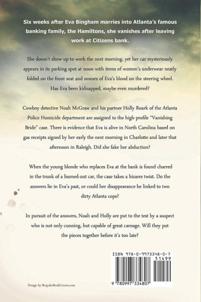 Six weeks after Eva Bingham marries into Atlanta's famous banking family, the Hamiltons, she vanishes after leaving work at Citizens Bank. She doesn't show up to work the next morning, yet her car mysteriously appears in its parking spot at noon with items of women's underwear neatly folded on the front seat and smears of Eva's blood on the steering wheel. Has Eva been kidnapped, maybe even murdered? Cowboy detective Noah McGraw and his partner Holly Roark of the Atlanta Police Department's Homicide division are assigned to the high-profile "Vanishing Bride" case. They find evidence that Eva is alive in North Carolina based on gas receipts signed by her early the next morning in Charlotte and later that afternoon in Raleigh. Did she fake her abduction? When the young blonde who replaces Eva at the bank is found charred in the trunk of a burned-out car, the case takes a bizarre twist. Do the answers lie in Eva's past, or could her disappearance be linked to two dirty Atlanta cops? In pursuit of the answers, Noah and Holly are put to the test by a suspect who is not only cunning, but capable of great carnage. Will they put the pieces together before it's too late?