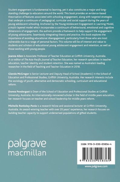 Student engagement is fundamental to learning, yet it also constitutes a major and long-standing challenge to educators around the world. This book provides an evidence-based theorisation of features associated with schooling engagement, along with targeted strategies that underpin a continuum of pedagogical, curricular and social support during the years of young adolescent schooling. Anchored by the Young Adolescent Engagement in Learning Model, a multi-layered model which incorporates a continuum of behavioural, emotional and cognitive dimensions of engagement, the authors provide a framework to help support the engagement of young adolescents. Seamlessly integrating theory and practice, this book explores the importance of avoiding educational disengagement, particularly from those who are most vulnerable due to a range of personal factors. This volume will be of interest and value to students and scholars of educational young adolescent engagement and retention, as well as those working with young people.
