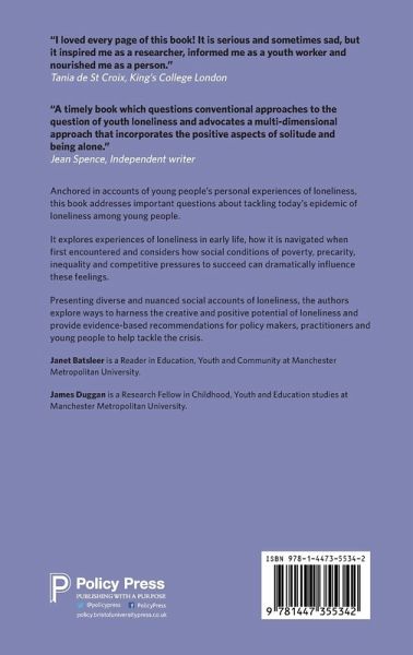 Anchored in accounts of young people's personal experiences of loneliness, this book addresses important questions about tackling today's epidemic of loneliness among young people. It explores experiences of loneliness in early life, how it is navigated when first encountered and considers how social conditions of poverty, precarity, inequality and competitive pressures to succeed can dramatically influence these feelings. Presenting diverse and nuanced social accounts of loneliness, the authors explore ways to harness its creative and positive potential and provide evidence-based recommendations for policymakers, practitioners and young people to help tackle the crisis.