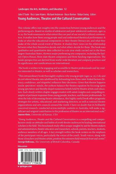 This volume offers rare insights into the connection between young audiences and the performing arts. Based on studies of adolescent and post-adolescent audiences, ages 14 to 25, the book examines to what extent they are part of our society's cultural conversation. It studies how these young people read and understand theatrical performance. It looks at what the educational components in their theatre literacy are, and what they make of the whole social event of theatre. It studies their views on the relationship between what they themselves decide and what others decide for them. The book uses qualitative and quantitative data collected in a six-year study carried out in the three largest Australian States, thirteen major performing arts companies, including the Sydney Opera House, three state theatre companies and three funding organisations. The book's perspectives are derived from world-wide literature and company practices and its significance and ramifications are international.The book is written to be engaging and accessible to theatre professionals and lay readers interested in theatre, as well as scholars and researchers. "This extraordinary book thoroughly explains why young people (ages 14-25+) do and do not attend theatre into adulthood by delineating how three inter-linked factors (literacy, confidence, and etiquette) influence their decisions. Given that theatre happens inside spectators' minds, the authors balance the theatre equation by focusing upon young spectators and thereby dispel numerous beliefs held by theatre artists and educators. Each clearly written chapter engages readers with astute insights and compelling examples of pertinent responses from young people, teachers, and theatre professionals. To stem the tide of decreasing theatre attendance, this highly useful book offers pragmatic strategies for artistic, educational, and marketing directors, as well as national theatre organizations and arts councils around the world. I have no doubt that its brilliantly conceived research, conducted across multiple contexts in Australia, will make a significant and original contribution to the profession of theatre on an international scale." Jeanne Klein, University of Kansas, USA "Young Audiences, Theatre and the Cultural Conversation is a compelling and comprehensive study on attitudes and habits of youth theatre audiences by leading international scholars in the field. This benchmark study offers unique insights by and for theatre makers and administrators, theatre educators and researchers, schools, parents, teachers, students, audience members of all ages. A key strength within the book centers on the emphasis of the participant voices, particularly the voices of the youth. Youth voices, along with those of teachers and theatre artists, position the extensive field research front and center." George Belliveau, The University of British Columbia, Canada