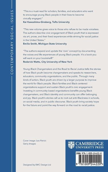 1. Introduction: young black changemaking and the road to racial justice Laura Wray-Lake Elan C. Hope and Laura S. Abrams; 2. Young black changemaking: civic actions with a purpose Elena Maker Castro Laura Wray-Lake and Dominique Mikell Montgomery; 3. Non-black school spaces: how black youth encounter and resist racism Jason Anthony Plummer Domonique Kianna Henderson and Laura Wray-Lake; 4. Identity and changemaking: what it means to be black and pursuing racial justice Elan C. Hope Channing J. Mathews and Laura Wray-Lake; 5. Launching points: how black youth start their changemaking journeys Laura Wray-Lake Sara Wilf and Mariah Bonilla; 6. Families: a keystone of young black changemaking Dominique Mikell Montgomery Domonique Kianna Henderson Victoria Millet Elan C. Hope and Laura Wray-Lake; 7. Organizations: hubs for developing black youth's civic agency Laura Wray-Lake Sara Wilf Mariah Bonilla and Elena Maker Castro; 8. Summer 2020: young black changemakers confronting racial injustice Laura S. Abrams Jason Anthony Plummer and Laura Wray-Lake; 9. Freedom dreaming: hope for racial justice and lasting change Laura Wray-Lake Elan C. Hope Laura S. Abrams Mariah Bonilla Domonique Kianna Henderson Elena Maker Castro Channing J. Mathews Dominique Mikell Montgomery Victoria Millet Jason Anthony Plummer and Sara Wilf.