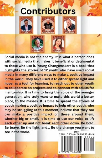 Social media is not the enemy. It is what a person does with social media that makes it beneficial or detrimental to those who use it. Young Changemakers is a book that highlights the stories of 12 youth who have used social media in many different ways to make a positive impact in the world. They have used it to either spread light and hope, as a tool for learning, to reach out to other youth to collaborate on projects and to connect with adults for mentorship. These are just 12 of many young people who are doing the same! It is time to bring the voice of the younger generation, who truly want to make this world a better place, to the masses. It is time to spread the stories of youth making a positive impact to help other youth, who may be struggling at this moment, believe that they too can make a positive impact on those around them, whether big or small. It is time to use our voice to lift each other up and not break each other down. Be bold. Be brave. Be the light, and... Be the change you want to see in the world. Co-Authors: Anagha Rajesh (UAE/India), Arianna Fox (USA), Kellina Powell (Canada), Liza Magaña (El Salvador), Manasi Patil (India), Noor Yousef Aldalahma (Jordan), Rion Cruz (USA), Riyad Maroof Hassan (India), Sanju Kahuja (India), Sarah Syed (Canada), Siddhita Mohanty (India), Zackary Ford (USA). Foreword by: Naveen Jain Introduction by: Kristi Maggio Afterword by: Bruce Pulver I Wish I Knew Then... Evan Carmichael & Glenn Marsden