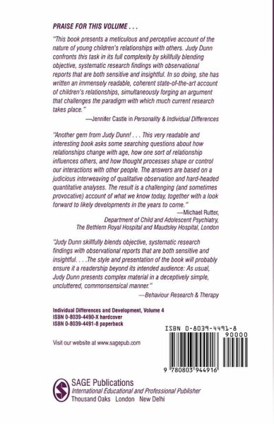 `Another gem from Judy Dunn! This very readable and interesting book asks some searching questions about how relationships change with age, how one sort of relationship influences others and how thought processes shape or control our interactions with other people.... The result is a challenging (and sometimes provocative) account of what we know today, together with a look forward to likely developments in the years to come. The book is a must for anyone interested in either the social development of children or the meaning of interpersonal relationships' - Michael Rutter, Institute of Psychiatry, London How and why do children of the same family have strikingly different relationships with their mother and father, with each other and with their friends? Dunn provides a careful examination of current research in the area; she examines how these differences in close relationships originate, whether they are linked to one another and whether troubled parent-child relationships can result in children having difficulties making friends in later life. The author also considers whether it is possible to specify at what stage of development particular relationships are likely to have effects on other relationships; the influence of cultural concepts on the perception and conduct of close relationships; children's social understanding and its impact on relationships; and differences in children's temperament and attachment behaviour.