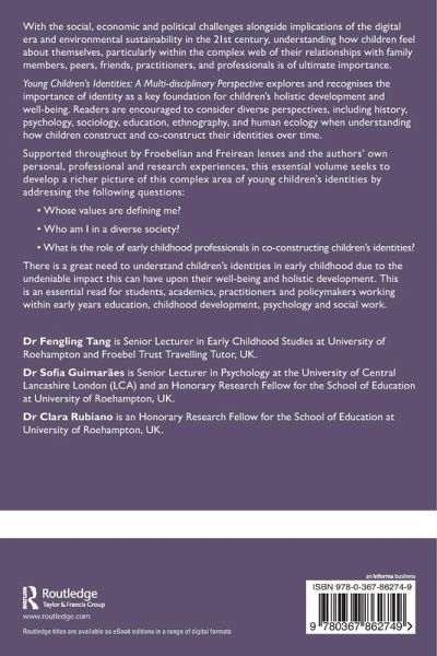 Young Children's Identities: A Multi-disciplinary Perspective explores and recognises the importance of identity as a key foundation for children's holistic development and wellbeing. Readers are encouraged to consider diverse perspectives, including history, psychology, sociology, education, ethnography, and human ecology when understanding how children construct and co-construct their identities over time.