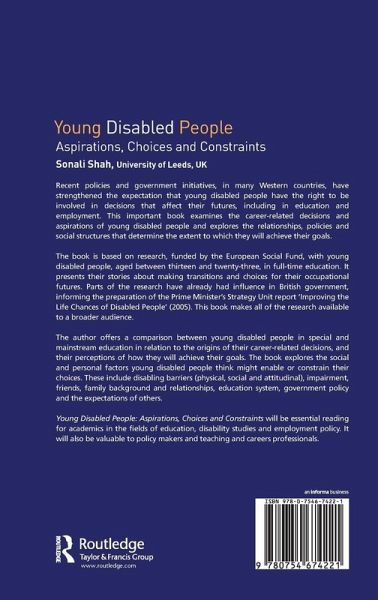Recent policies and government initiatives in many Western countries have strengthened the expectation that young disabled people have the right to be involved in decisions affecting their futures. Many of the choices that are currently taken out of young disabled people's hands, including those relating to education and future employment, are now being viewed as an opportunity to encourage participation in the decision making process. Sonali Shah uses a comparative study of young disabled students within mainstream and special education to determine the influence these recent policies will have on the realization of their long term goals. Young Disabled People: Aspirations, Choices and Constraints will be essential reading for academics in the fields of education, disability studies and employment policy. It will also be valuable to policy makers and teaching and careers professionals.
