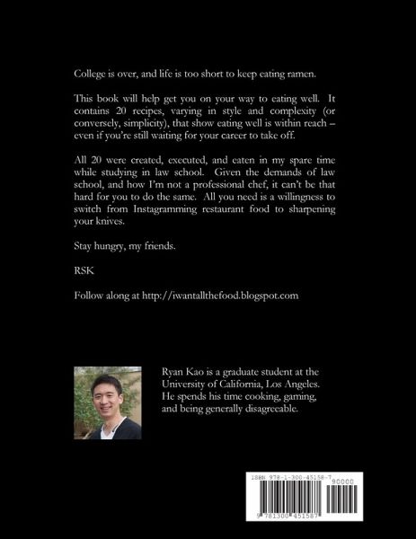 College is over, and life is too short to keep eating ramen. This book will help get you on your way to eating well. It contains 20 recipes, varying in style and complexity (or conversely, simplicity), that show eating well is within reach - even if you're still waiting for your career to take off. All 20 were created, executed, and eaten in my spare time while studying for law school. Given the demands of law school, and how I'm not a professional chef, it can't be that hard for you to do the same. All you need is a willingness to switch from Instagramming restaurant food to sharpening your knives. Stay hungry, my friends. RSK Follow along at http://iwantallthefood.blogspot.com