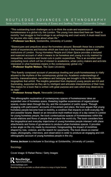 This ethnographic exploration of contemporary spaces of homelessness takes an expanded view of homeless space, threading together experiences of organizational spaces, routes taken through the city and the occupation of public space. Through engaging with participants' accounts of movement and place, the book argues that young homeless people become fixed in mobility, a condition that impacts on both everyday life and possible futures. Based on an innovative multi-method study of a day centre in London for young homeless people, the book contextualizes spaces of homelessness within the social relations and flows of people that produce the world city.