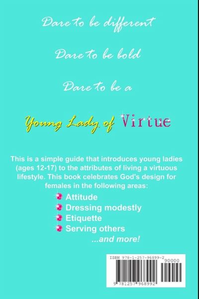 This is a simple guide that introduces young ladies (ages 12-17) to the attributes of living a virtuous lifestyle. This book celebrates God's design for females. The information presented is based on the biblical scriptures of Proverbs 31 (age-appropriate).