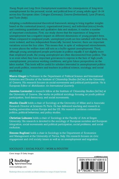 Adopting a multidimensional theoretical framework aiming to bring together insights based on the contextual (macro), organizational (meso), and individual (micro) levels, and combining quantitative and qualitative data and analyses, it reaches a number of important conclusions. First, our study shows that the experience of long-term unemployment has a negative impact on different dimensions of young people's lives. When compared to employed youth, unemployed youth are less satisfied with their lives, more isolated, and less independent financially. Second, however, there are important variations across the four cities. This means that, in spite of widespread retrenchments, in some places the welfare state still acts as a buffer against unemployment. Third, although young unemployed people participate in politics equally if not slightly more than employed youth, the young unemployed are often disconnected from politics. This is so even when they have important grievances to express in the face of high youth unemployment, precarious working conditions, and grim future perspectives on the labor market. This book will be useful for scholars interested in unemployment politics and youth politics, researchers and teachers in political science, sociology, and social psychology.