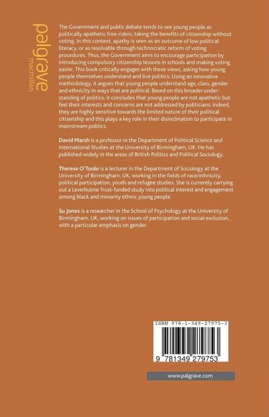 DAVID MARSH is Professor in the Department of Political Science and International Studies at the University of Birmingham, UK. He has published widely in the areas of British Politics and Political Sociology. THERESE O'TOOLE is Lecturer in the Department of Sociology at the University of Birmingham, UK working in the fields of 'race'/ethnicity, political participation, youth and refugee studies. She is currently carrying out a Leverhulme Trust funded study of Political Interest and Engagement among Black and Minority Ethnic Young People. SU JONES is a Researcher in the School of Psychology at the University of Birmingham, UK working on issues of participation and social exclusion with a particular emphasis on gender.