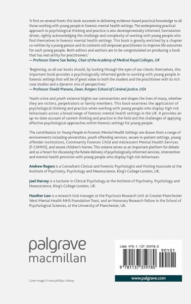 Foreword; James McGuire.- Chapter 1. Introduction; Andrew Rogers, Joel Harvey, Heather Law and Jenny Taylor.- Chapter 2. "Through My Eyes": A Young Person's Experience of Forensic Mental Health Settings; Lola-Rose Morris, Emma Jamieson and Rebecca Marshall.- Chapter 3. Psychological Practice in Community Settings; Simone Fox and Berit Ritchie.- Chapter 4. Psychological Practice in Secure Settings; Clare Snodgrass and Jackie Preston.- Chapter 5. Youth Violence Risk Assessment: A Framework for Practice; Lorraine Johnstone and Leanne Gregory.- Chapter 6. Whole Systems Approaches; Brigitte Squire, Tom Jefford and Cindy Swenson.- Chapter 7. Violence Among Young People: A Framework for Assessment and Intervention; Wendy Morgan.- Chapter 8. Sexually Harmful Behaviour; Trudy Potter and Sarah Reeves.- Chapter 9. Fire Setting in Adolescence; Abigail Willis.- Chapter 10. Self-harming Behaviour; Joel Harvey, Alison Sillence and Kirsty Smedley.- Chapter 11. Substance Misuse; Lisa Shostak and Ben Harper.- Chapter 12. Intellectual Disabilities; Charlotte Staniforth and Eve Griffin.- Chapter 13. Autistic Spectrum Disorder; Eve Griffin and Charlotte Staniforth.- Chapter 14. Young People's Self-Disclosure in Secure Forensic Settings; Joel Harvey and Luke Endersby.- Chapter 15. Developing Safe and Strong Foundations: The DART Framework; Andrew Rogers and Miranda Budd.
