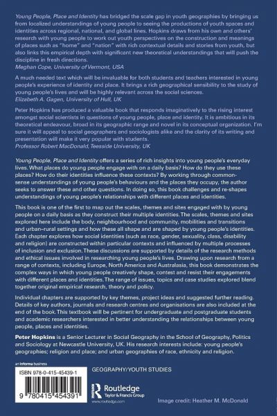 Young People, Place and Identity offers a series of rich insights into young people's everyday lives. What places do young people engage with on a daily basis? How do they use these places? How do their identities influence these contexts? By working through common-sense understandings of young people's behaviours and the places they occupy, the author seeks to answer these and other questions. In doing so the book challenges and re-shapes understandings of young people's relationships with different places and identities. The textbook is one of the first books to map out the scales, themes and sites engaged with by young people on a daily basis as they construct their multiple identities. The scales explored here include the body, neighbourhood and community, mobilities and transitions and urban-rural settings and how these all shape and are shaped by young people's identities. Each chapter explores how social identities (such as race, gender, sexuality, class, disability and religion) are constructed within particular contexts and influenced by multiple processes of inclusion and exclusion. These discussions are supported by details of the research methods and ethical issues involved in researching young people's lives. Drawing upon research from a range of contexts, including Europe, North America and Australasia, this book demonstrates the complex ways in which young people creatively shape, contest and resist their engagements with different places and identities. The range of issues, topics and case studies explored include: ethical and methodological issues in youth research; youth subcultures; experiences of home; territorialism; youth and crime; political engagement and participation; responses to global issues; engagements with different institutional contexts; negotiating public space; the transition to adulthood; drinking cultures. The author explores these issues through blending together original empirical research, theory and policy. Individual chapters are supported by key themes, project ideas and suggested further reading. Details of key authors, journals and research centres and organisations are also included at the end of the book. This textbook will be pertinent for undergraduate and postgraduate students and academic researchers interested in better understanding the relationships between young people, places and identities.