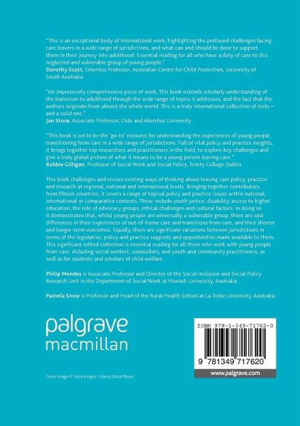 Foreword; Mike Stein.- Introduction; Philip Mendes and Pamela Snow.- Part I. Particularly vulnerable groups of care leavers. - Chapter 1. The Double-Bind - Looked After Children and Youth Justice; Nicola Carr and Siobhan McAlister.- Chapter 2. Young People Transitioning from Out-of-home Care in Victoria, Australia: Strengthening Support Services for Dual Clients of Child Protection and Youth Justice; Philip Mendes, Pamela C. Snow and Susan Baidawi.- Chapter 3. Supporting young people with an intellectual disability transitioning from out-of-home care to adult life in Queensland, Australia; Sarah McDonald, Kathleen Ellem and Jill Wilson.- Chapter 4. A comparison of young people with a disability transitioning from out-of-home care in Australia and Northern Ireland; Pamela C. Snow, Berni Kelly, Philip Mendes and Delia O'Donohue.- Part II. Pathways to Educational Success.- Chapter 5. Comparisons of policy and practice assisting care leavers into higher education in different jurisdictions/countries, and the role of international benchmarking; Andrew Harvey, Patricia McNamara and Lisa Andrewartha.- Chapter 6. I want to be someone, I want to make a difference: Young care leavers preparing for the future in South Australia; Dee Michell and Claudine Scalzi.- Chapter 7. Muddling Upwards: The Unexpected, Unpredictable and Strange on the Path from Care to High Achievement; Jacqueline Z Wilson and Frank Golding.- Chapter 8. The contribution of a key scenario to care leavers' transition to adulthood in Israel; Yifat Mor-Salwo and Anat Zeira.- Chapter 9. The drawback of getting by - Implicit imbalances in the educational support of young people in and leaving care in Germany; Stefan Kongeter, Wolfgang Schroer and Maren Zeller.- Part III. Comparative policy and practice in different jurisdictions.- Chapter 10. Legislation, policy and practice: Developments in the United Kingdom and Scandinavia; Emily R. Munro, Anne-Kirstine Mølholt and Katie Hollingworth.- Chapter 11. Involving peer researchers in studies of young people in and leaving care - Reflections from research in England, Northern Ireland and Argentina; Berni Kelly, Jo Dixon and Mariana Incarnato.- Chapter 12. Researching care leavers in an ethical manner in Switzerland, Germany, Israel and China; Samuel Keller, Benjamin Strahl, Tehila Refaeli and Claire (Ting) Zhao.- Part IV. An analysis of policy and practice in specific jurisdictions.- Chapter 13. Young people transitioning from care in Australia - a critical but neglected area of policy development; Toni Beauchamp.- Chapter 14. CREATE's advocacy for young people transitioning from care in Australia; Joseph J. McDowall.- Chapter 15. Journeys of Exclusion: Unpacking the experience of adolescent care leavers in New Zealand; Nicola Atwool.- Chapter 16. Transitioning from care in Vietnam: Policy context and practice strategies; Mary Elizabeth Collins and Bùi Th Thanh Tuy n.- Chapter 17. Young People Transitioning from Care in South Africa: Welfare Contexts, Research and Practice; Adrian Van Breda and Lisa Dickens.- Chapter 18. Improving institutional care to enhance outcomes for care leavers in Russia; Evgenia Stepanova and Simon Hackett.- Chapter 19. Cast out and Punished, the experiences of care leavers in Jordan; Rawan Ibrahim.- Chapter 20. The role of informal leaving care peer support networks in Romania; Gabriela Dima and John Pinkerton.